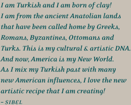 This was instilled in me during my undergraduate and graduate studies at the University of Marmarra in Istanbul. For over ten years, I had my ceramics gallery in Kusadasi on the Aegean Coast of Turkey. And now, I have become a sort of Turkish artistic ambassador to America. I think it is part of my artistic responsibility to draw from the previous generations and – through my hands, eyes, and heart – carry that wisdom and spirit into the future.